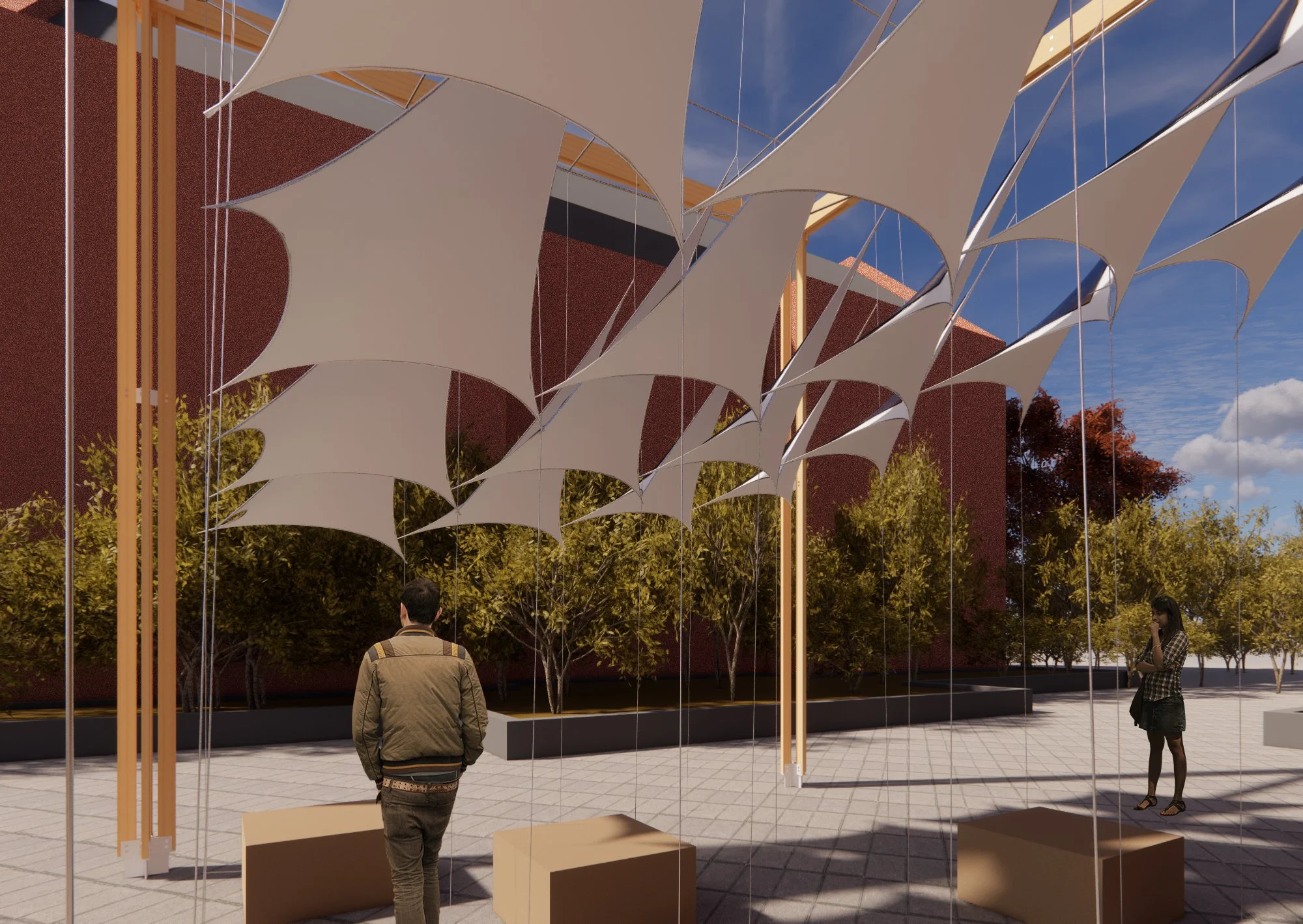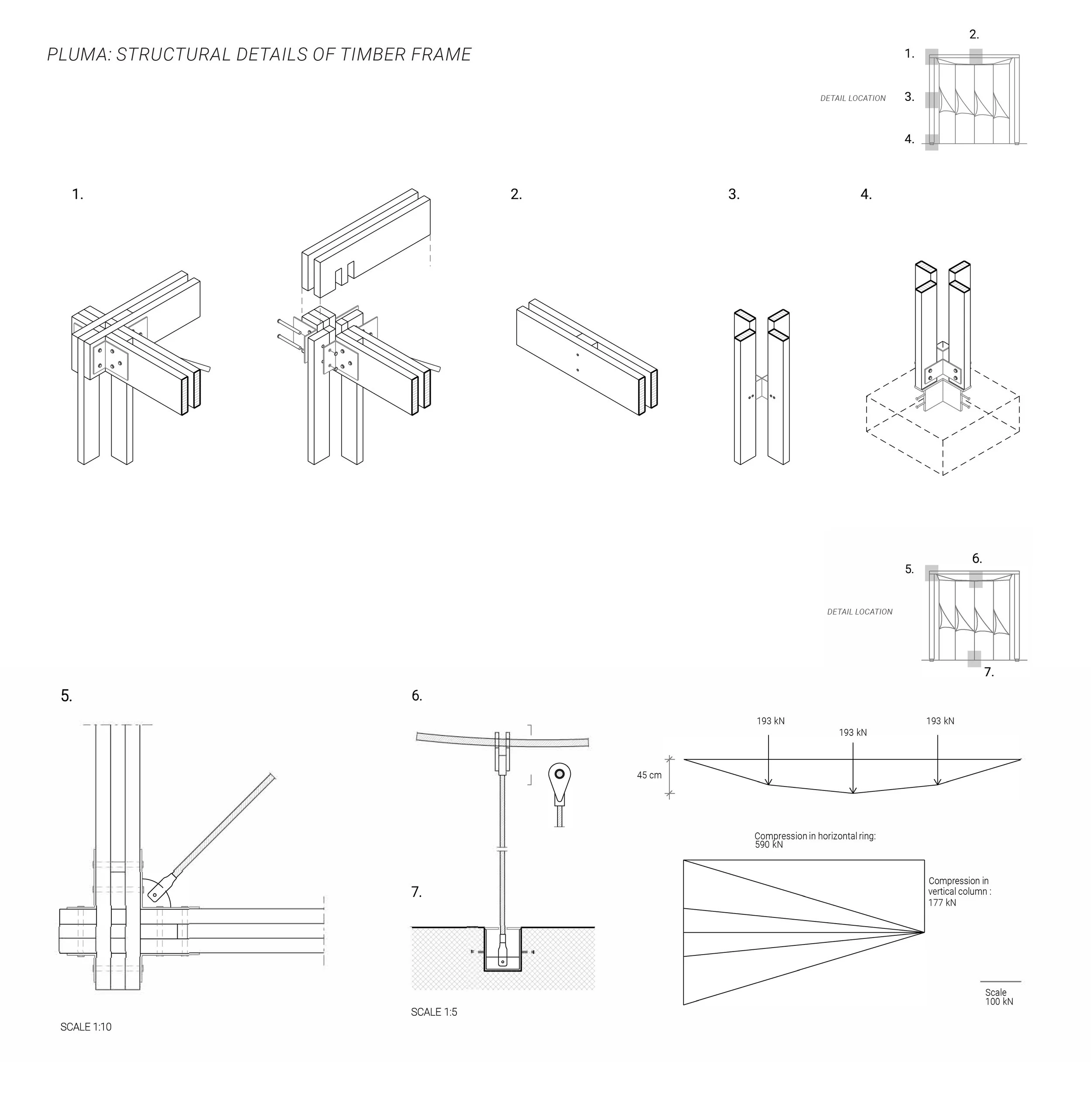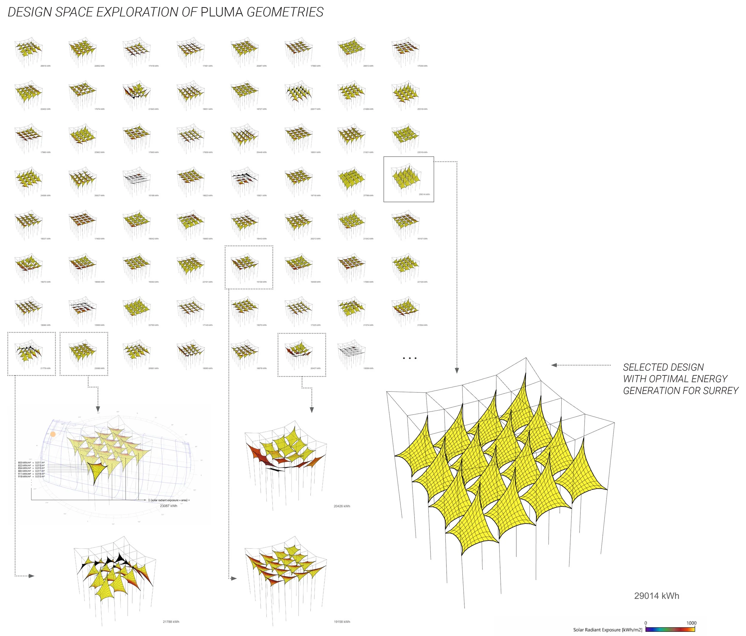 Pluma demonstrates how form can follow function across disciplines and performance metrics. The design features photovoltaic membranes suspended in a lightweight cable system, resembling a flock of birds in flight. The shape and orientation of the membrane ensemble is precisely tuned by an optimization algorithm to maximize solar radiation exposure and power generation on the site in Surrey. Its supporting frame consists of standard timber elements assembled into cruciform sections, with simple, repeated connection details that are cost effective.